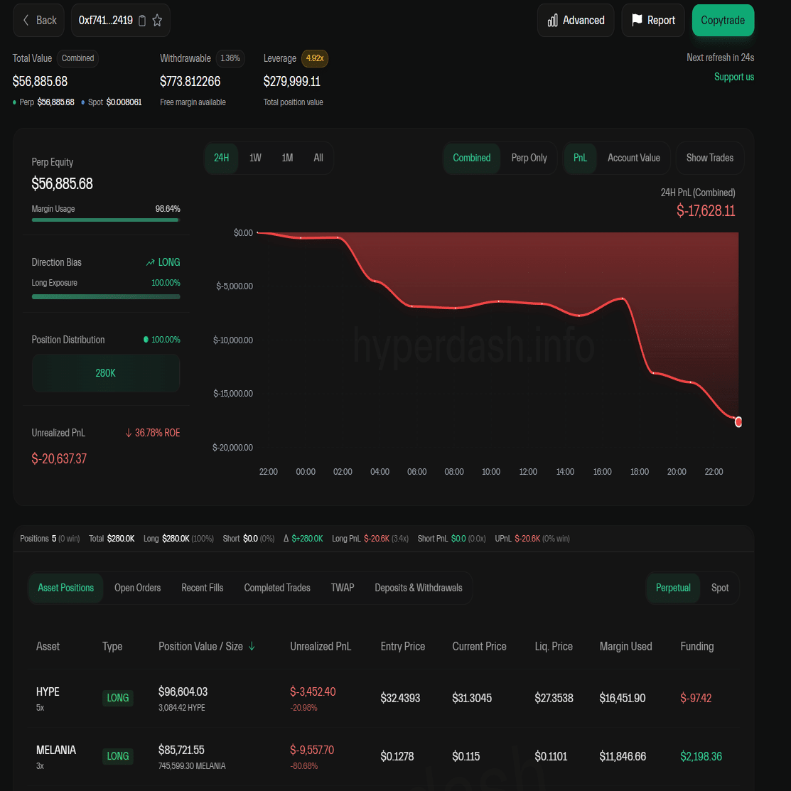 例えばmelaniaコインはcoinglassでポジション・清算マップともに表示することができません。そういう場合にはHyperDash頼りになります。