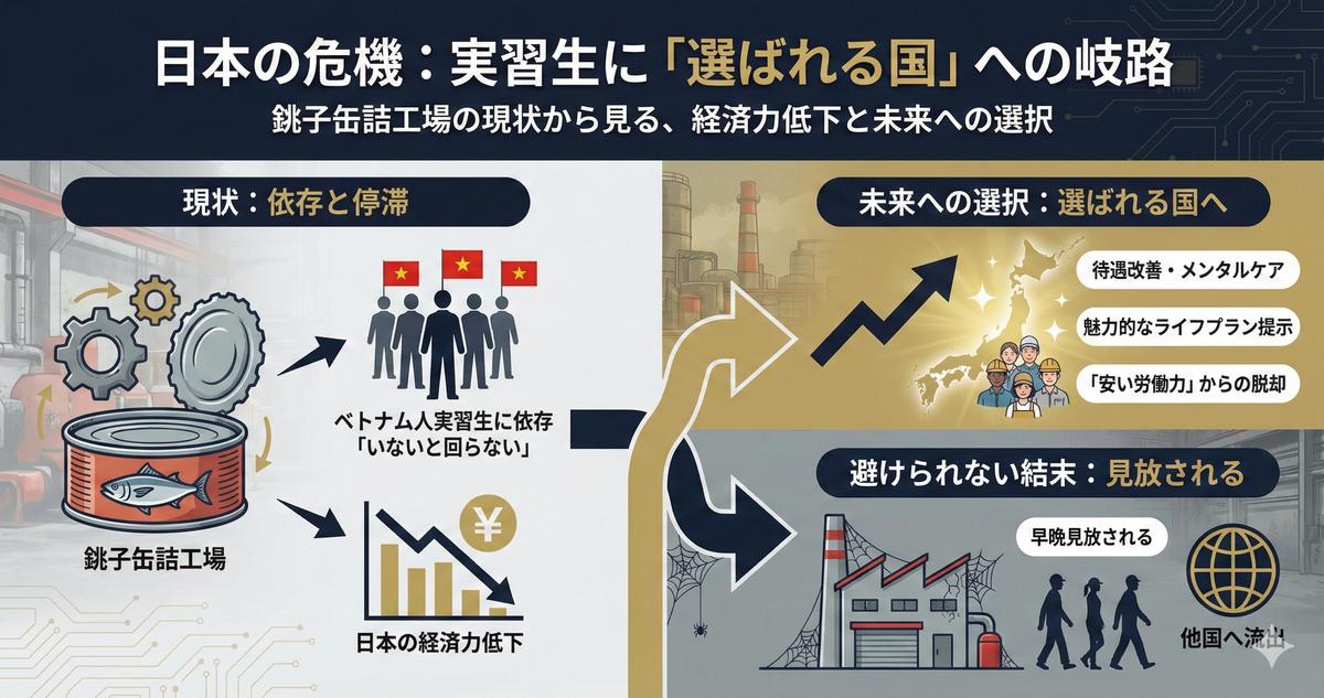 千葉県銚子市の缶詰工場では、従業員の2割にあたる16人がベトナム人技能実習生であり、社長は「銚子の1次産業は外国人なしでは成り立たない」と語る。