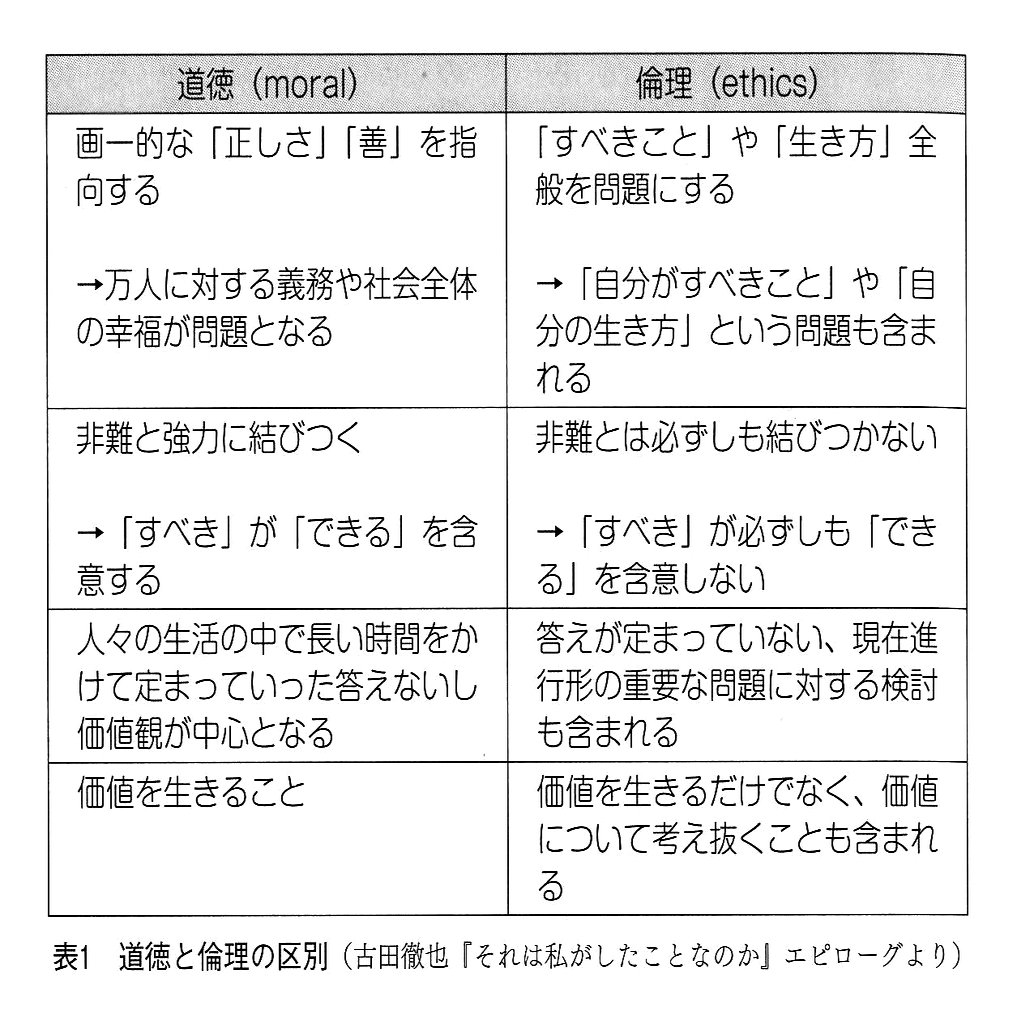 先の表では、三、四行目がこのことを指摘しています。道徳は、定まった答えや価値をなぞること、つまり「価値を生きること」が中心になるのに対し、倫理は「価値について考え抜くこと」をも含むのです。