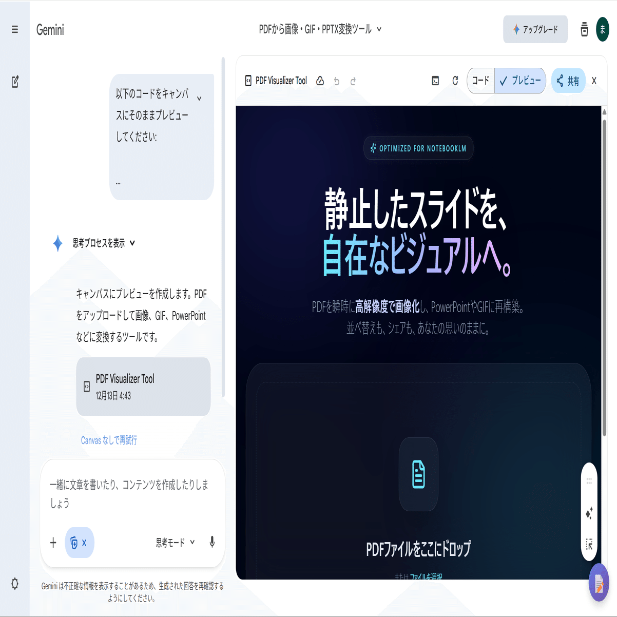 Gemini(思考モード)でCanvasをオンにして、