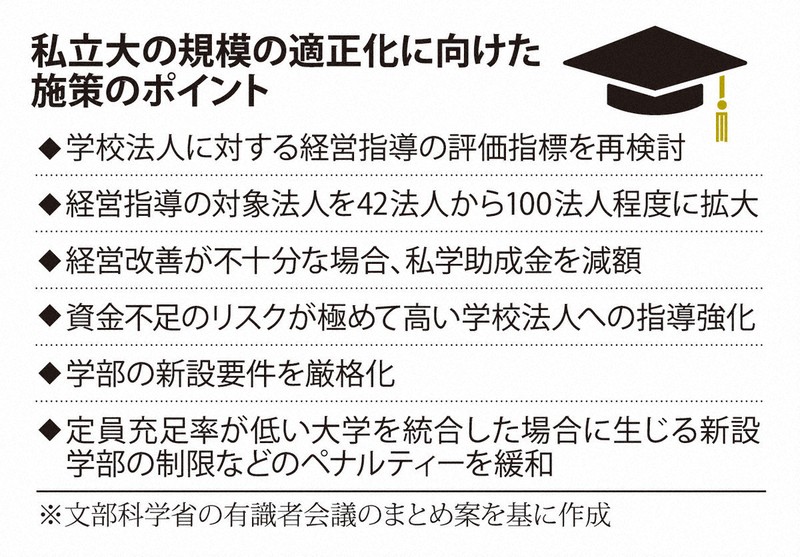 急速な少子化を踏まえた私立大の在り方を検討する文部科学省の有識者会議は15日、規模の適正化を進めるための施策など審議のまとめ案を示した。経営状況が悪化した学校法人に対する文科省の指導対象を現状の倍以上に増加。取り組みが不十分な場合は私学助成金を減額したり、原則5年で改善しなければ規模の縮小や閉鎖を勧告したりするなど、指導内容も強化する。