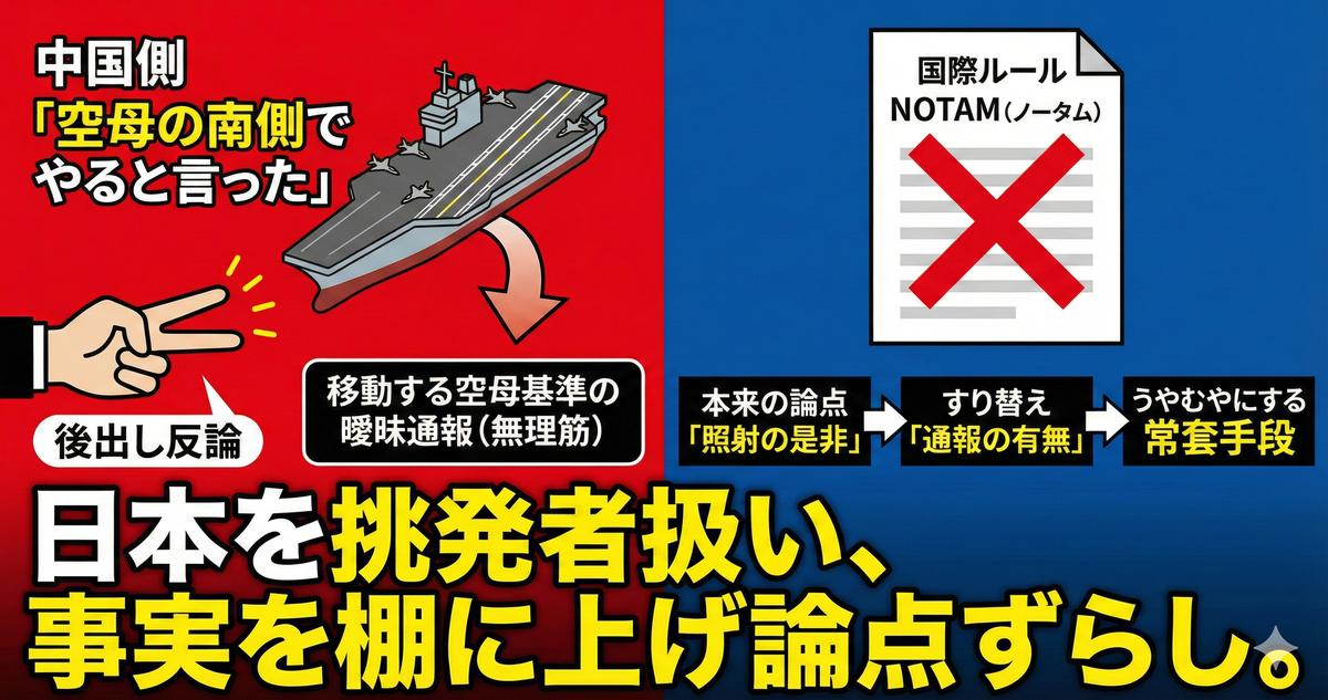 空母は移動する物体だ。緯度経度で範囲を指定する「NOTAM」を出さずに、動く船を基準に「ここが訓練海域だ」と言い張るのは、後から何とでも言える詭弁に過ぎない。