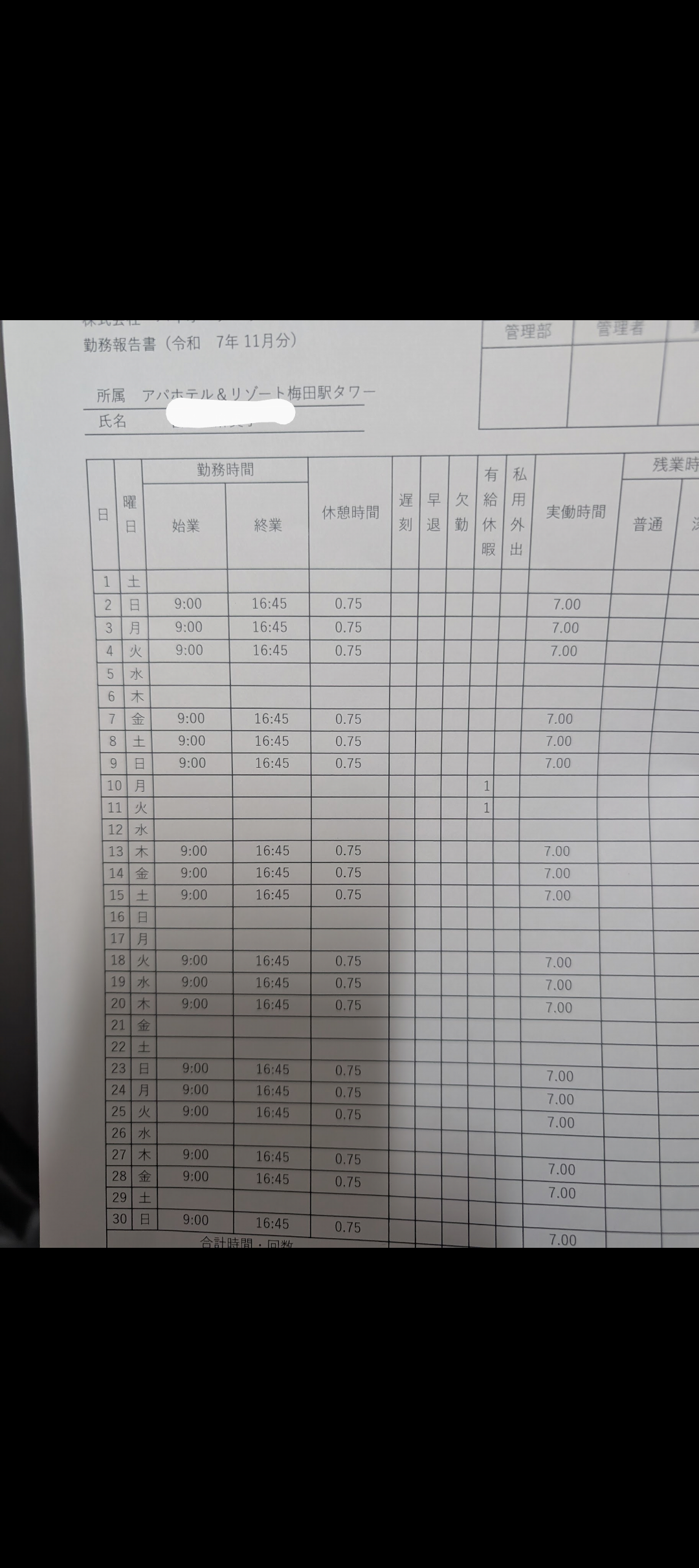 11月の勤務報告書。