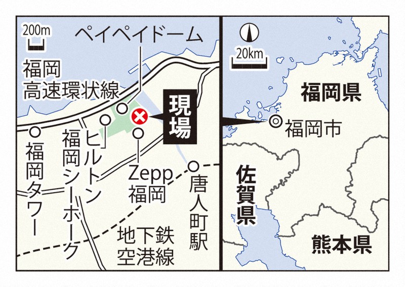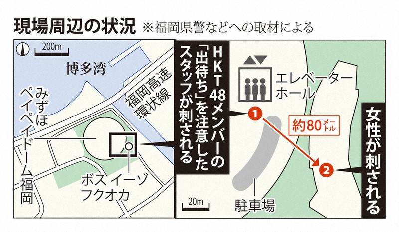 事件は14日夕、HKT48の劇場が入る商業施設「ボス イーゾ フクオカ」と、隣接する「みずほペイペイドーム福岡」の2カ所で起きた。HKT48はファンとメンバーがビデオ通話で交流する「オンライン握手会」を開き、一部のメンバーがイーゾ内の事務所にいた。事件を受け、握手会は中止となり、同じく入居する「よしもと福岡劇場」もイベントを中止した。