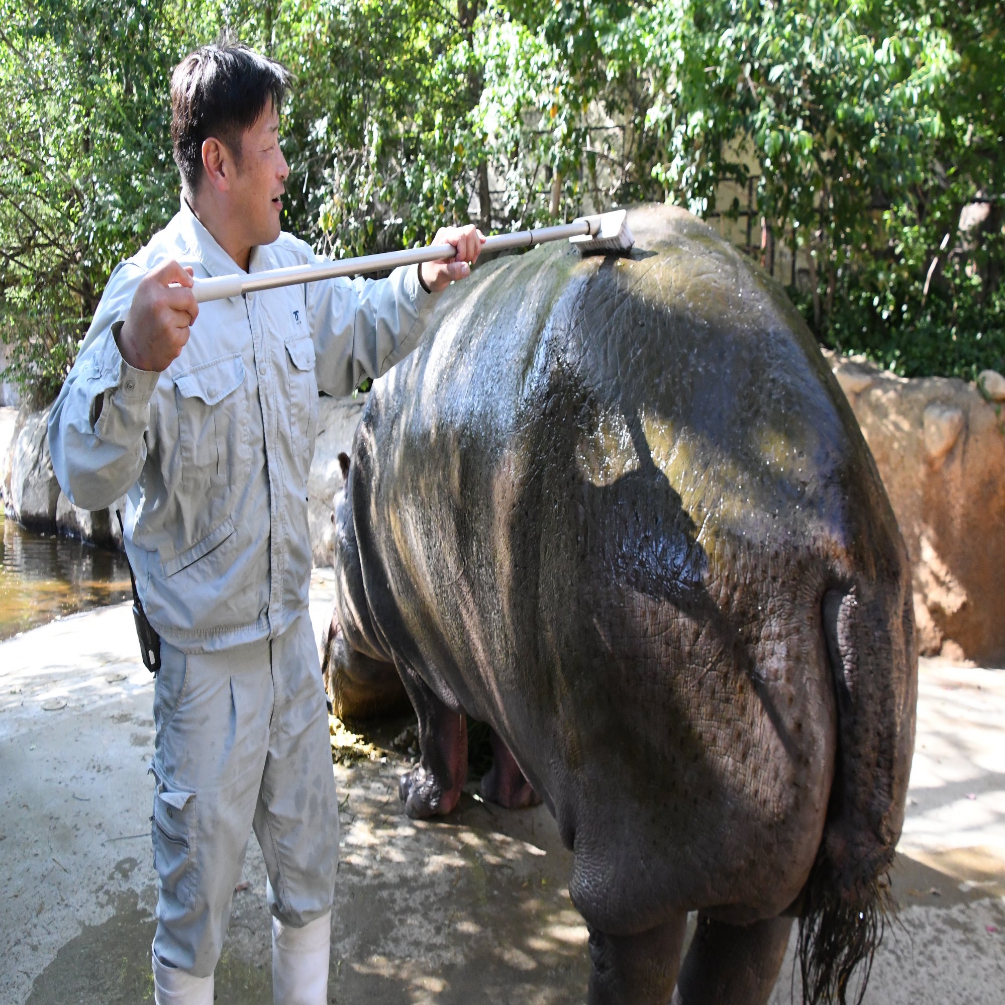 カバは今、ナミコと出目男の2頭がいます。出目男を担当したのは私が21歳のときで、もう31年も前になります。当時は先輩の作業を見て覚えるスタイルで、初めて一人で餌をあげようとしたときに、出目男に顔で跳ね飛ばされてしまいました。出目男にしてみれば軽く突き飛ばしただけだったんでしょうけど(笑)