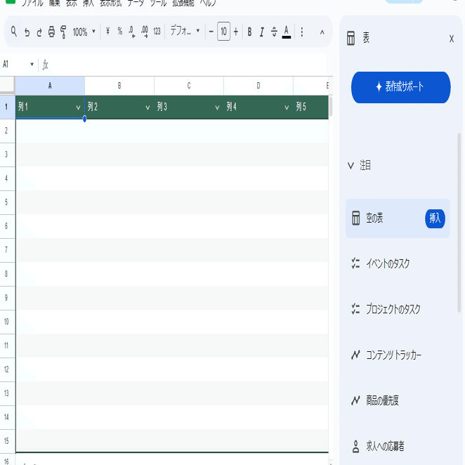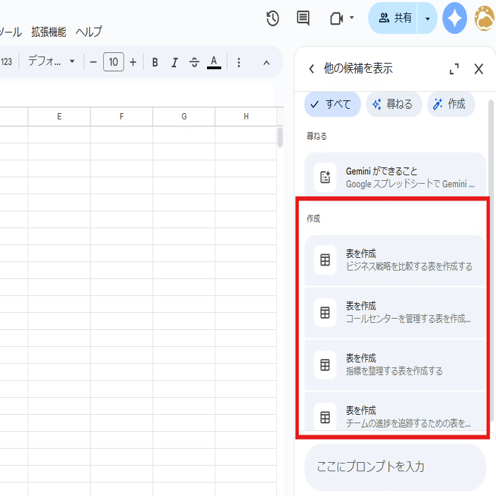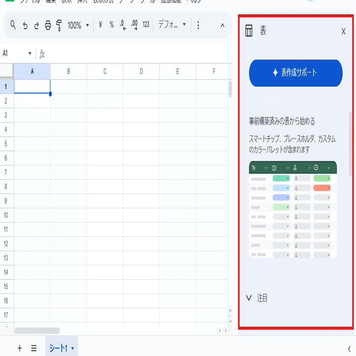 Geminiと連携したスプレッドシートの場合は「表作成サポート」が表示されます。