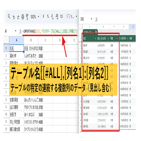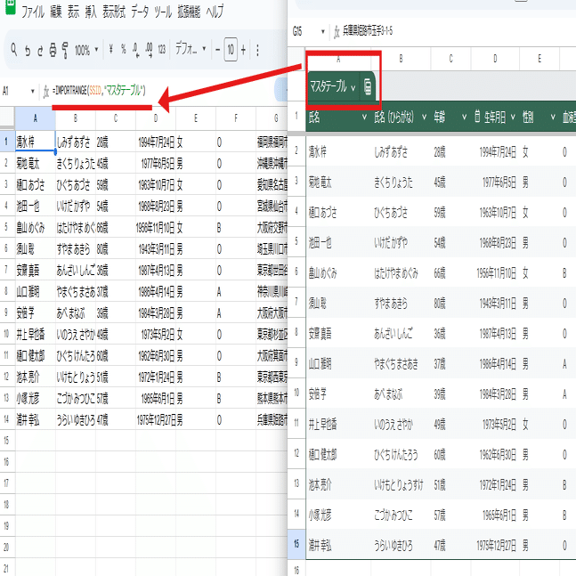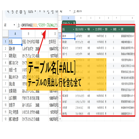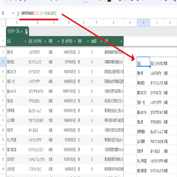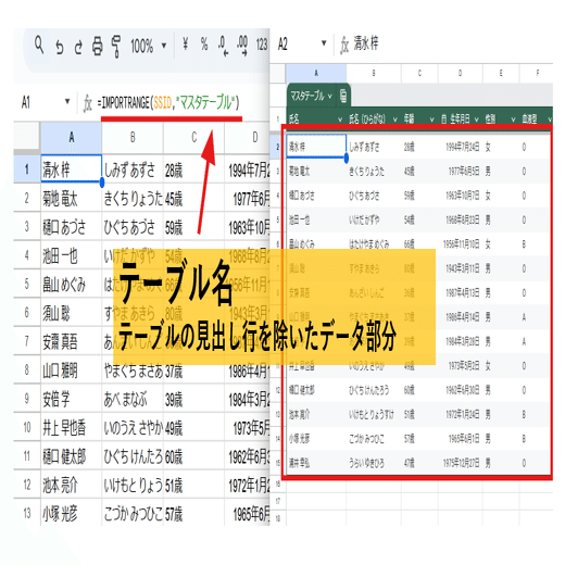 =IMPORTRANGE(SSID,"マスタテーブル[[#ALL],[氏名]:[年齢]]")