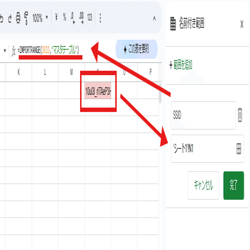 参照するテーブルが「マスタテーブル」というテーブル名で、そのテーブルがあるスプレッドシートのIDが入ったセルを SSIDと名前付き範囲で定義した場合