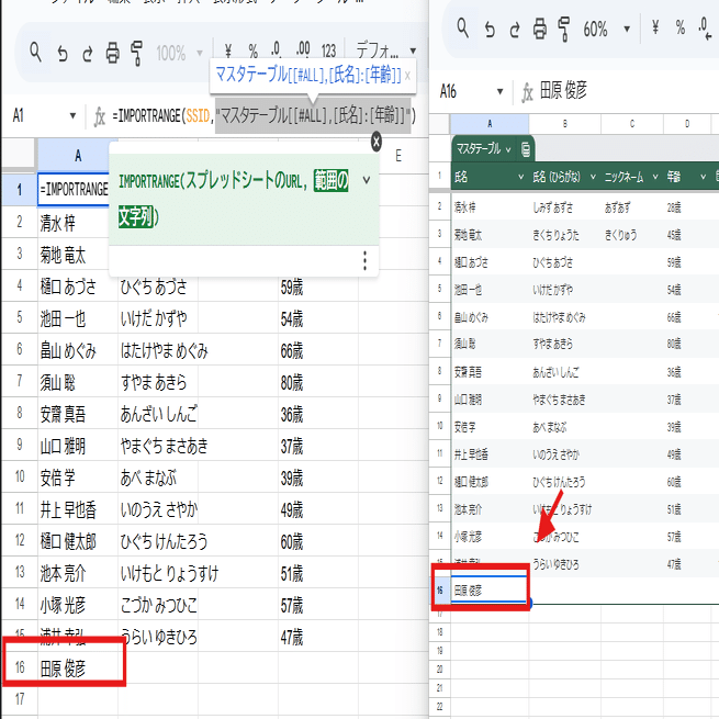 "マスタテーブル[[#ALL],[氏名]:[年齢]]" と、氏名の列 ~ 年齢の列まで参照という指定なので、間に1列「ニックネーム」が追加されても、動的に参照する範囲が拡張されます。