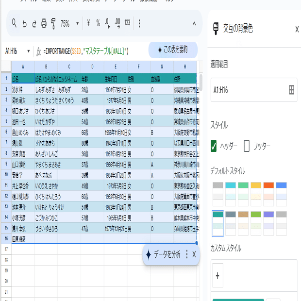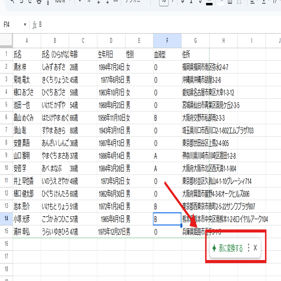 提案からテーブル化した表は、生年月日が 日付形式、性別や血液型はプルダウンとして、列の型が自動的に定義されます。