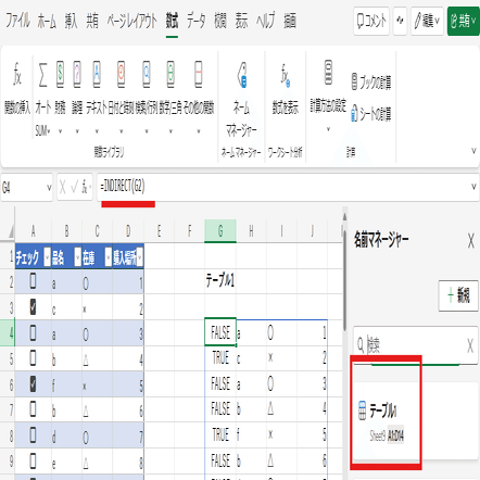 Excelの場合は、テーブルを作成すると テーブル名は自動で「名前の管理」(ネームマネージャー)に登録され、文字列のテーブル名を使ってINDIRECTでテーブルを参照することが可能です。