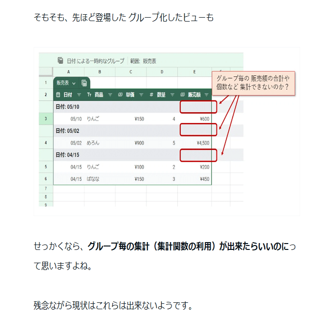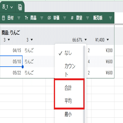 Excelのテーブルの集計行や、先に書いたGoogleスプレッドシートのテーブルの新機能 グループ集計のような 集計方法を選択するようなものではありません。
