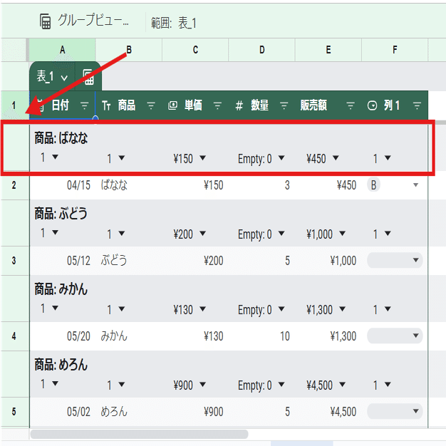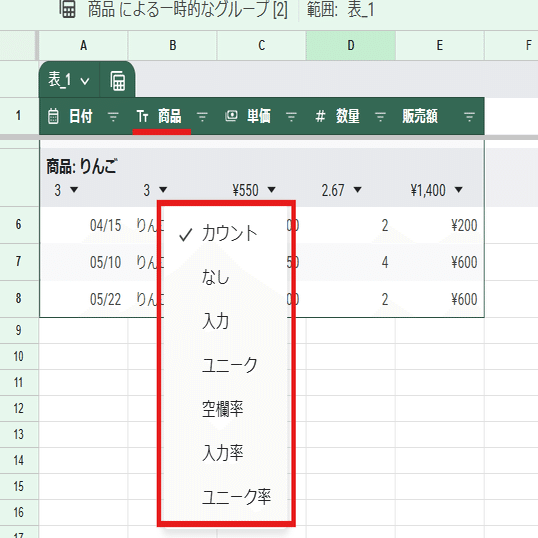 グループ毎に ▼がついてますが、選択した集計は列単位で適用されます。