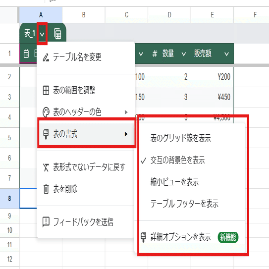 表の高度な書式設定は 表の名前横にある V から 表の書式を選ぶと確認できます。