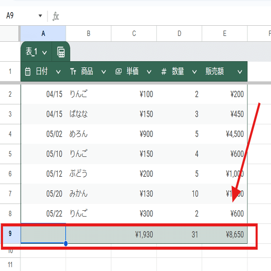 この時、数値型に指定されている列があれば、自動でフッター行には合計が表示される仕様となっています。