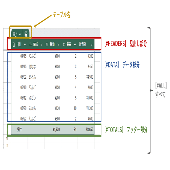 注意しなければならないのは、テーブル名だけを指定した場合、参照するのは見出しを除いたテーブルのデータ部分って点です。