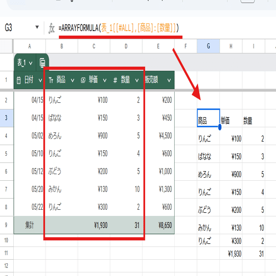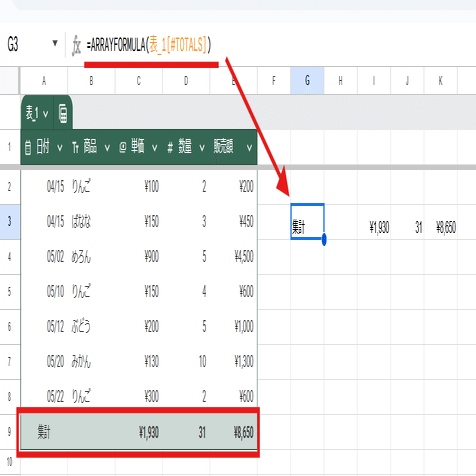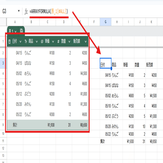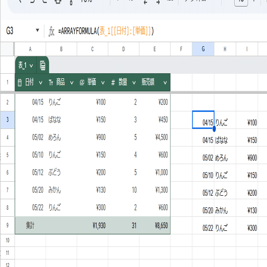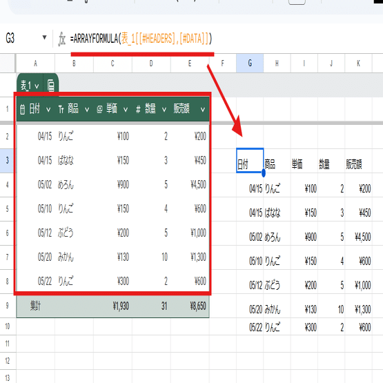 これはテーブルは見出し行に数式を入れられないというルールがあるので仕方ないんですが、テーブルを参照してるのに結果をテーブルとして表示出来ないのは残念。