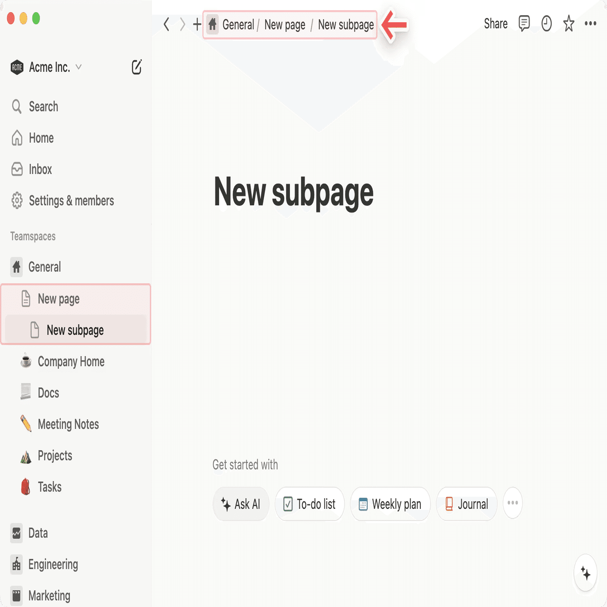 一方、Notionはフォルダ構造を持ったメモアプリで、ページの中に子ページを作ることができます。こちらは明確にトポグラフィ的なUIになっています。
