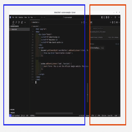 最も有名なAIコーディングソフトであるCursorでは、左側(青枠)に普通のコードエディタ、右側(赤枠)にAIとのチャット欄が表示されています。
