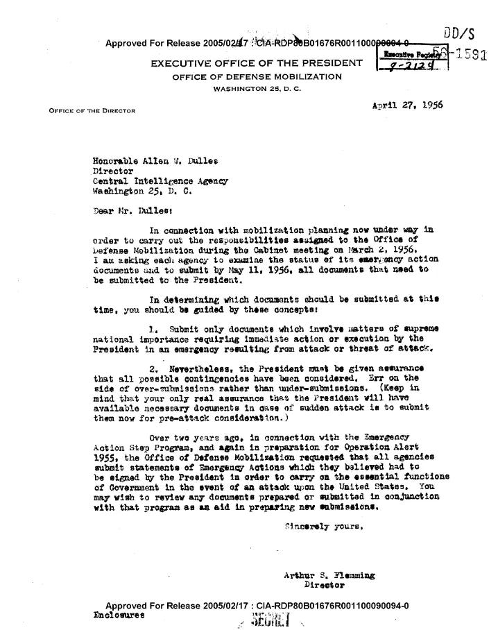 "EXECUTIVE OFFICE OF THE PRESIDENT OFFICE OF DEFENSE MOBILIZATION WASHINGTON 25, D.C. April 27, 1956 Office of the Director Honorable Allen W. Dulles Director Central Intelligence Agency Washington 25, D.C. Dear Mr. Dulles: In connection with mobilization planning now under way in order to carry out the responsibilities assigned at the Cabinet meeting of March 2, 1956, I am asking each agency to examine the status of emergency action documents and to submit by May 11, 1956, all documents that need to be submitted to the President. In determining which documents should be submitted at this time, you should be guided by these concepts: Submit only documents which involve matters of supreme national importance requiring immediate action or execution by the President in an emergency resulting from attack or threat of attack. Nevertheless, the President must be given assurance that all possible contingencies have been considered. Err on the side of over-submissions rather than under-submissions. (Keep in mind that your only real assurance that the President will have available necessary documents in case of sudden attack is to submit them now for pre-attack consideration.) Over two years ago, in connection with the Emergency Action Step Program, and again in preparation for Operation Alert 1955, the Office of Defense Mobilization requested that all agencies submit statements of Emergency Actions which they believed had to be signed by the President in order to carry on the essential functions of Government in the event of an attack upon the United States. You may wish to review any documents prepared or submitted in conjunction with that program as an aid in preparing new submissions. Sincerely yours, Arthur S. Flemming Director Approved for Release 2005/02/17: CIA-RDP80B01676R00100090094-0 Enclosures"