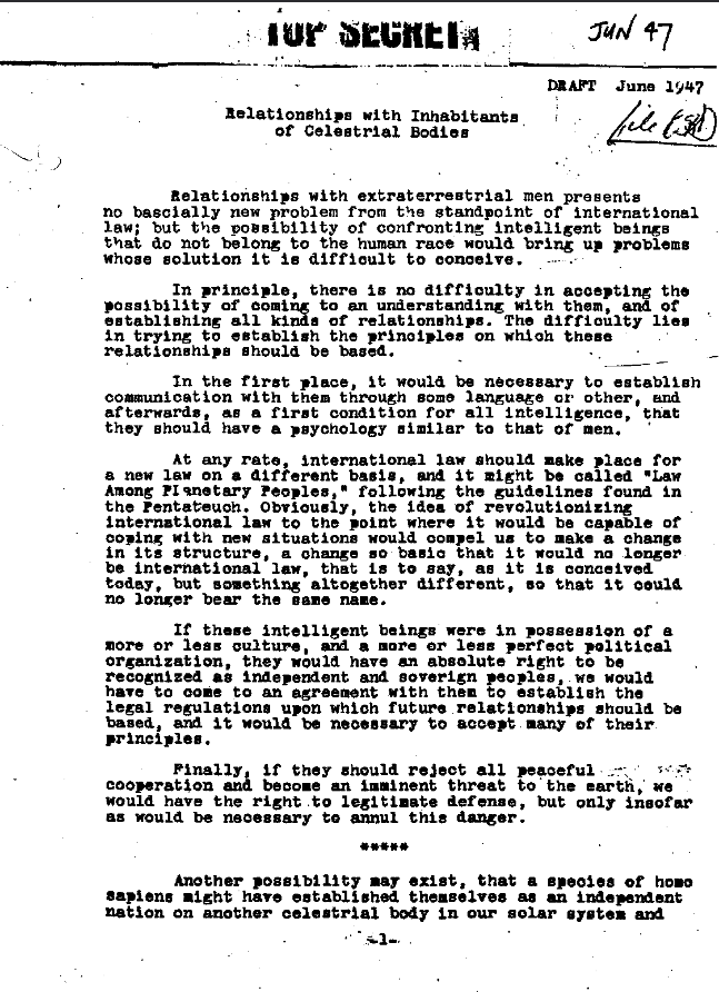 This six-page document, entitled “Relationships with Inhabitants of Celestial Bodies” and dated June 1947, is credited as the first official paper to introduce the term “Extraterrestrial Biological Entities,” or EBEs. It asserts that the military already accepts the existence of unidentified spacecraft as an established fact. The paper addresses the kinds of issues one would expect from serious scientific inquiry: the origins of these visitors, the legal implications of their presence, appropriate responses to potential colonization or integration with humanity, and their possible motives for being here. It warns that if EBEs wish to settle on Earth, it would trigger profound shifts in traditional legal concepts, potentially requiring a new framework termed “Law Among Planetary Peoples.” The document also proposes the development of a “Cosmic International Law” to safeguard the rights of all celestial states to claim unowned territories in the solar system. Additionally, it attributes the appearance of celestial craft in Earth’s atmosphere to the effects of military experiments involving fission and fusion weapons. The authors urge careful reflection on humanity’s current and historical actions in space, emphasizing the need to consider our future security and how to avert a dangerous outcome.