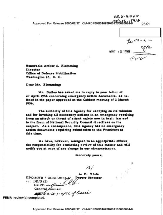 Washington 25, D. C.Dear Mr. Flemming: Mr. Dulles has asked me to reply to your letter of 27 April 1956 concerning emergency action documents, as defined in the paper approved at the Cabinet meeting of 2 March 1956.The authority of this Agency for carrying on its mission and for invoking all necessary actions in an emergency resulting from an attack or threat of attack exists now in basic law and in the form of National Security Council directives on the subject. As a consequence, this Agency has no emergency action documents requiring submission to the President at this time.We have, however, assigned to an appropriate officer the responsibility for continuing review of this matter and will notify you at once of any change in our circumstances.Sincerely yours,[signed]