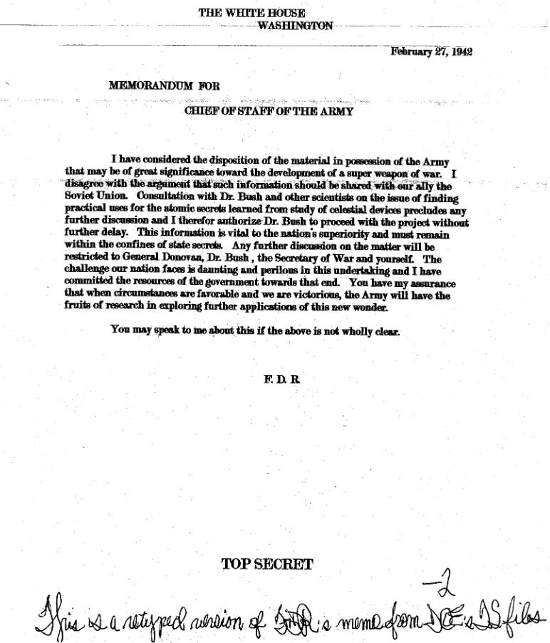 I have considered the disposition of the material in possession of the Army that may be of great significance toward the development of a super weapon of war. I disagree with the argument that such information should be shared with our ally the Soviet Union. Consultation with Dr. Bush and other scientists on the issue of finding practical uses for the atomic secrets learned from study of celestial devices precludes any further discussion and I therefore authorize Dr. Bush to proceed with the project without further delay. This information is vital to the nation’s superiority and must remain within the confines of state secrets. Any further discussion on the matter will be restricted to General Donovan, Dr. Bush, the Secretary of War and yourself. The challenge our nation faces is daunting and perilous in this undertaking and I have committed the resources of the government towards that end. You have my assurance that when circumstances are favorable and we are victorious, the Army will have the fruits of this research in exploring further applications of this new wonder.You may speak to me about this if the above is not wholly clear.F. D. R.TOP SECRET