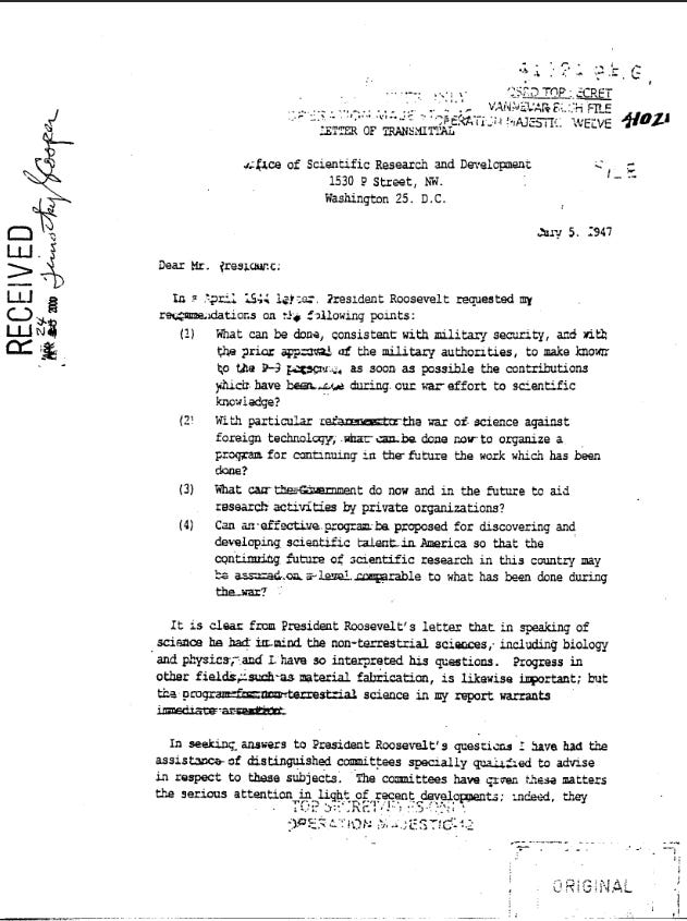 On July 5, 1947, possibly as a result of the New Mexico events, Vannevar Bush writes a memo to Truman recapping the status of the earlier investigations. As an apparent follow up by FDR to Bush, FDR wrote another letter (which we don’t have) in April 1944 requesting recommendations on four specific points. This letter is Bush’s answer. It is presumed that the Top Secret/Eyes Only Operation Majestic-12 classification was added at a later date. The letter also shows an “OK” and a Harry Truman signature. This letter is stamped with the known authentic “original” stamp, and was probably produced by a typewriter because of the uniformity of letter spacing. We expect to show, of course, that this format was commonly used by OSRD typewriters of the era. Bush restates the FDR questions for Truman’s benefit, mentions the assistance of distinguished committees, alludes to the “many meetings since the events of this summer,” transmits the full reports as appendices, and proposes a “single mechanism for implementing the recommendations of the several committees.” Could this be one hugely classified program called “Majestic Twelve” at the end of the summer? The date of the letter, 5 July, was, of course, coincident with the recoveries going on in New Mexico at that very time. Harry Truman’s “OK” may have been prophetic.