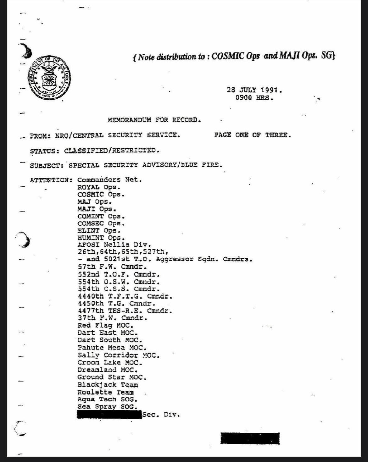 Here is a NRO Leaked document dated 28, July 1991, it reads at the top MAJI Ops ad MAJ ops…: