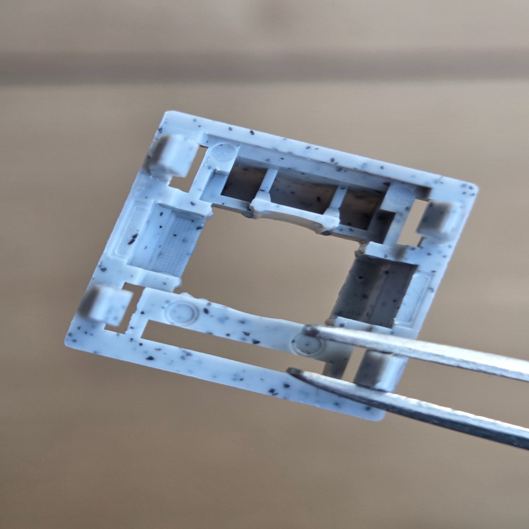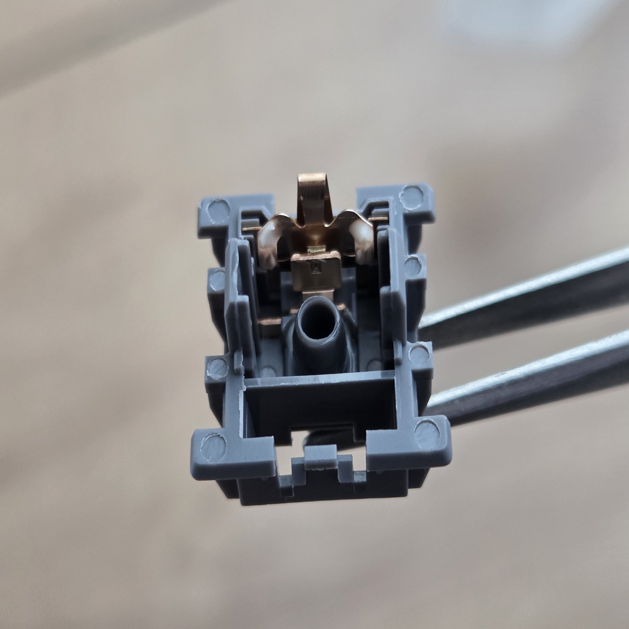Keygeek製のスイッチの場合、この部分はやや厚めに潤滑剤が塗布されている場合が多いです。この部分から音がすることがあるのですが、Keygeek製のスイッチの場合は、ほとんどない印象です。