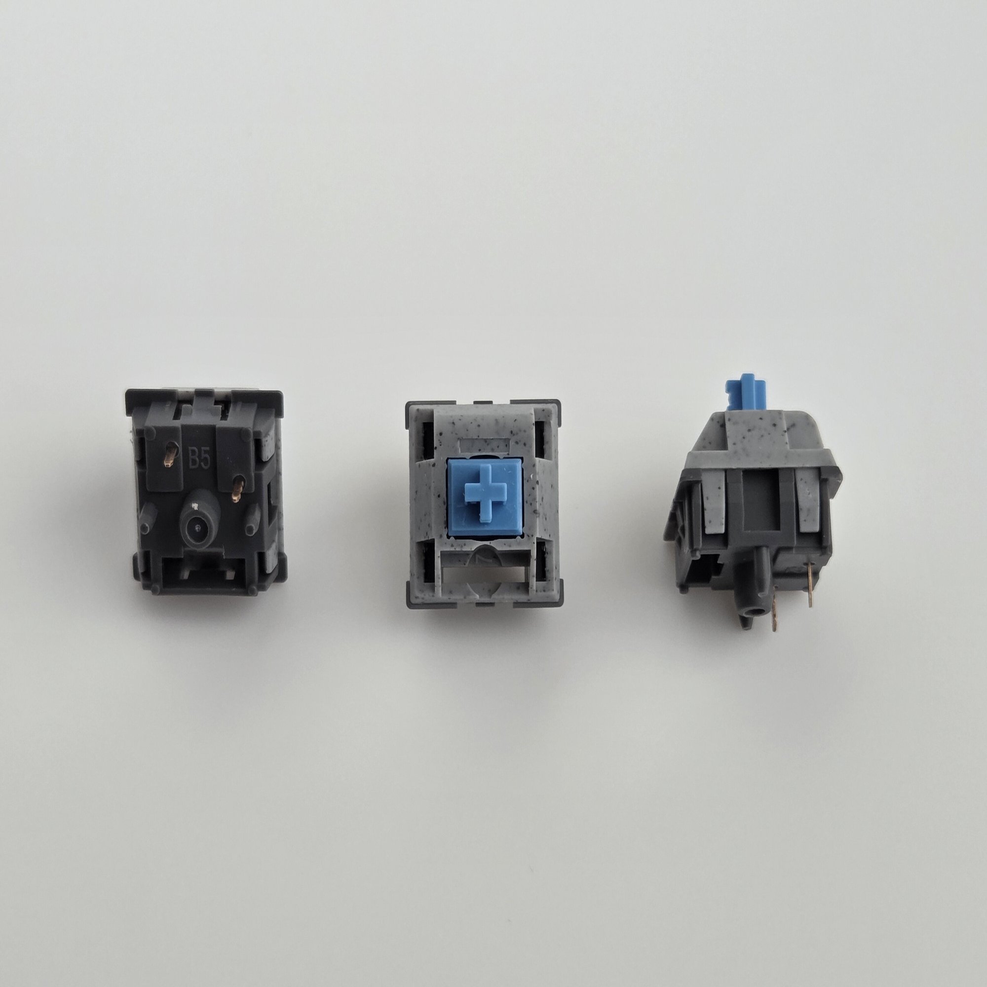 ダークグレーの下側(ボトムハウジング)に、グレーのマーブル調の上側(トップハウジング)、さらに、ライトブルーのステムというちょっと面白い見た目のスイッチです。