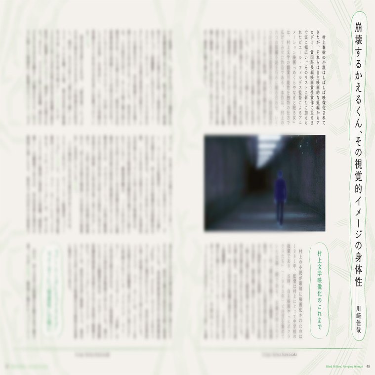 2022年、早稲田大学演劇博物館で行われた展示「村上春樹 映画の旅」の公式図録の編著を務めた執筆者が、過去の村上作品の映画化と比較しながら、初のアニメーション化となった本作のユニークさを解き明かす。『ドライブ・マイ・カー』、『バーニング』と共鳴しつつ、アニメーションならではの表現による独自の歩み。