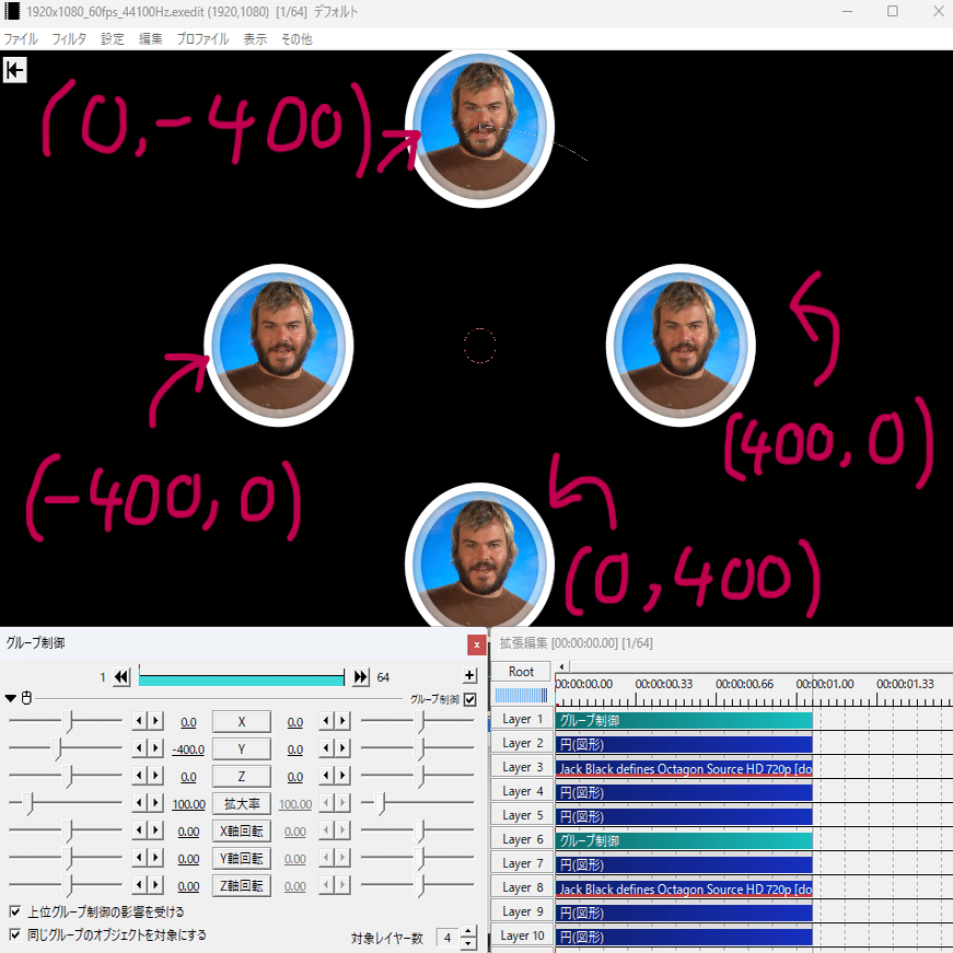 このグループ制御のXとYの移動方法を回転にします。移動フレーム間隔は後で調節するので今は適当でいいです。ここでXやYの座標をいい感じにします。必要な分コピペして、それぞれ座標を設定します。400感覚でやるとこんな感じです。
