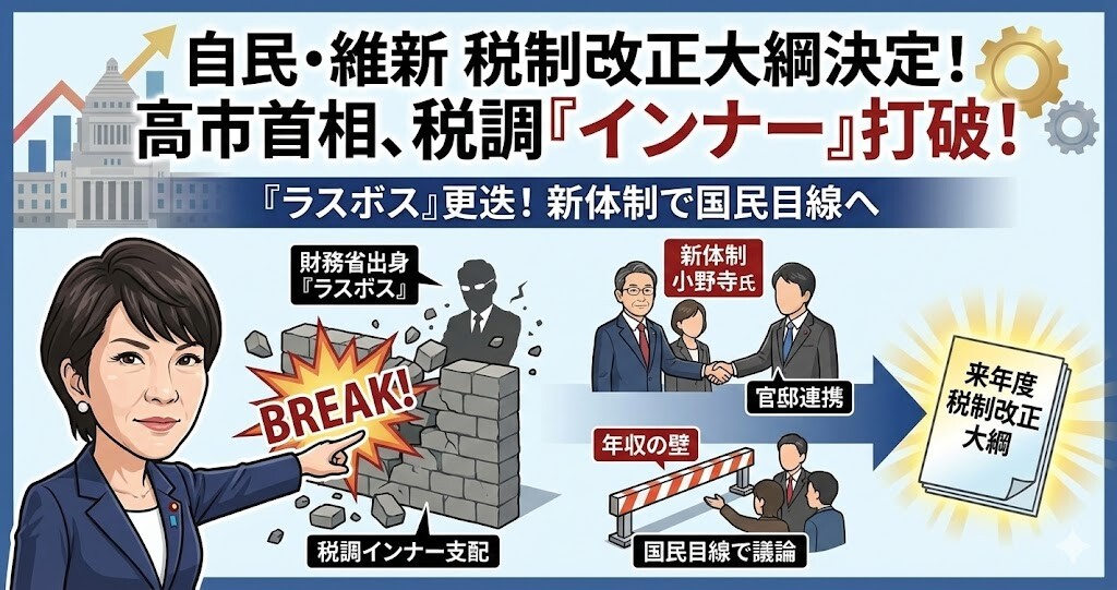 自民党と日本維新の会は19日、来年度の与党税制改正大綱を決定した。高市早苗首相(自民党総裁)は、一部の幹部が議論を主導する党税制調査会のスタイルを「ガラッと変えてほしい」と訴え、「ラスボス」と呼ばれた財務省出身のトップを交代させた。