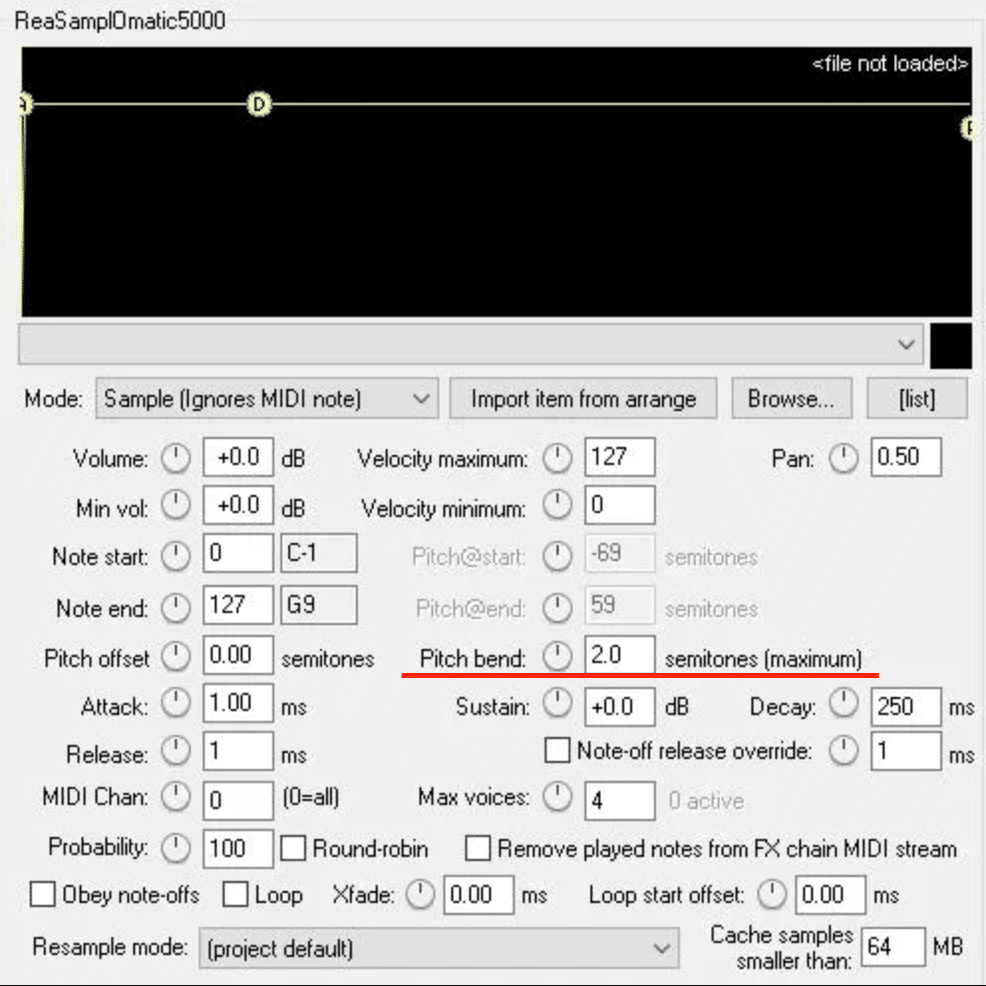 先ほど述べたようにピッチベンドの分解能の数値は一定で,幅(ベンド幅)を自由に決められます.ということは使うMIDIデータによってはベンド幅が変わり,ピッチベンドで高さを変えたときに正しく変化できないということが生じます.ベンド幅はサンプラー側で設定できます.