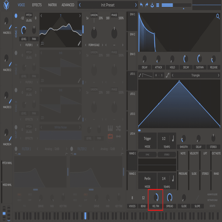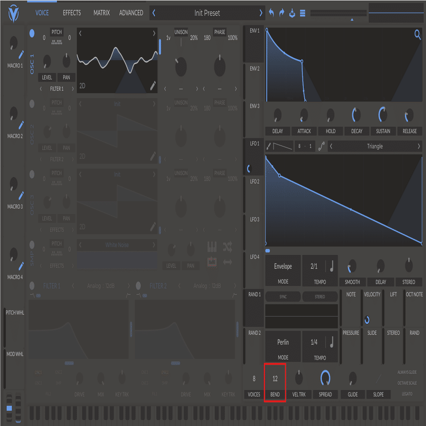 同時に鳴らす音の数を指定します.レガートを使用する際は基本的に単音(モノ)前提なのでここを1にします.
