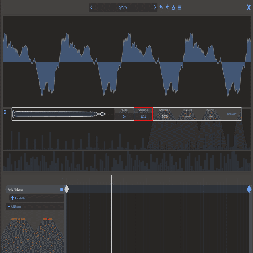 Vitalはサンプラーの機能もありますが,正確にはウェイブテーブルサンプラーです.私たちがサンプラーのように扱って使用する際は,元の波形をそのままある部分だけを抜き取りそこを一周期とした波形で音を鳴らす,といった手法で音を鳴らしています.しかしシンセ化した音声をそのまま使おうとすると,以下の画像のように元の音の周期の何倍もの範囲を一周期としてあつかっていることが多いです.なので一周期の長さを正しく打ち直す必要があります.この作業をするだけで素材の味の無さを大幅に軽減できると思います.