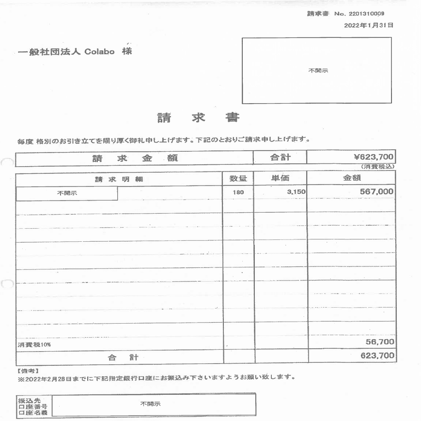 僕はColaboが保護した家出少女だけは公金で整体治療を受けられるって仕組みそのものが、公金の使い道として不適切だと思うんだけど、これが予算で実際に支払われた請求書がこちらだよ