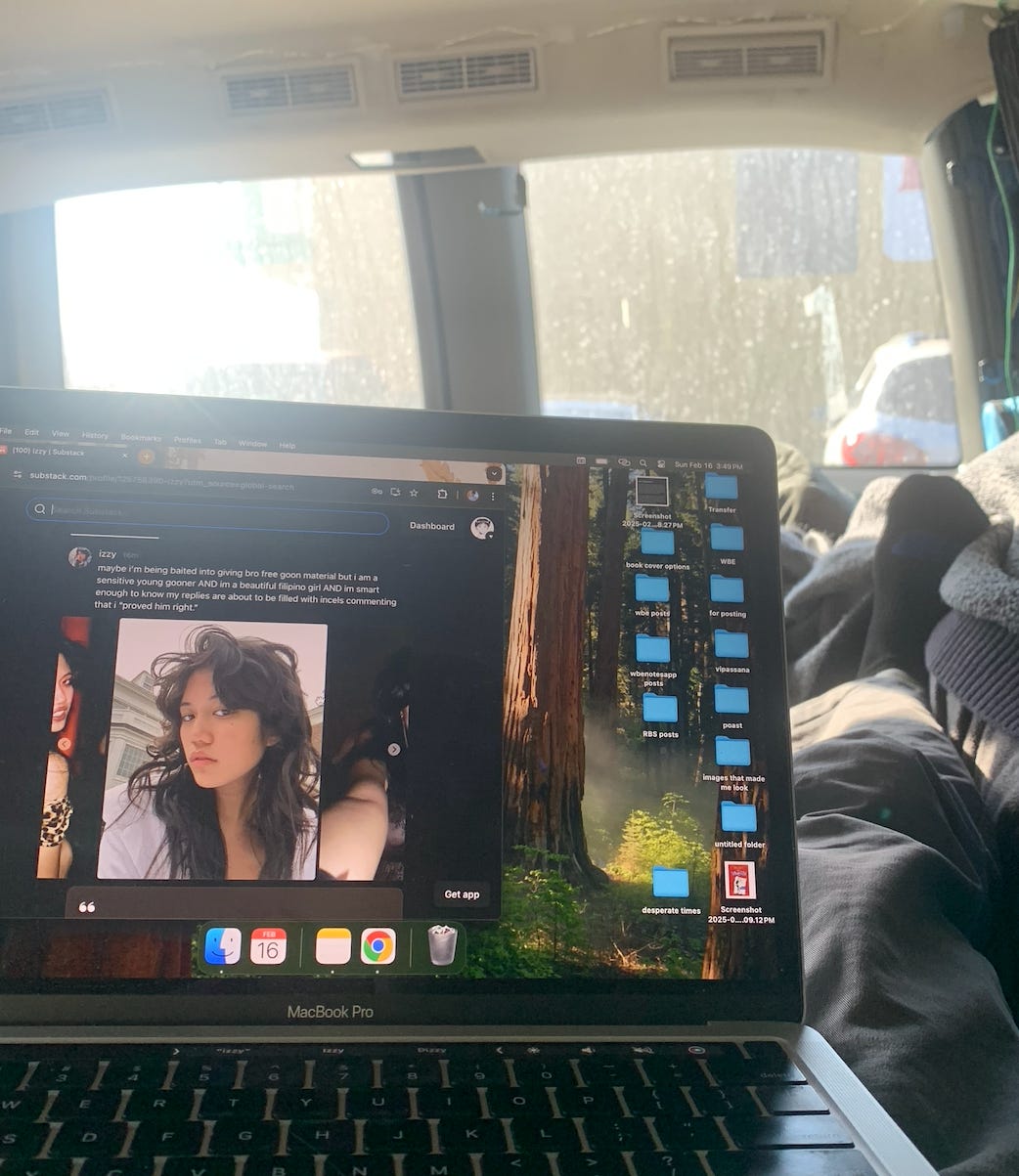 I’ll just be straightforwardly autistic about it: I have fucked 5 girls since becoming homeless in October. 3 of them were readers. 2 of them were in the van. 1 of them nourished my soul. She has since blocked me. Fuck my life.