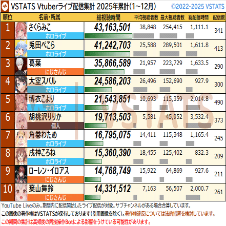 VSTATSでの独自集計によれば、今年のランキングの大勢はすでに決したと言えます。 1位はさくらみこ(約4,316万時間)、2位は兎田ぺこら(約4,124万時間)。前年と比べて順位は変わりましたが、ホロライブのトップ2が今年も不動の地位を築き、ワンツーフィニッシュで幕を閉じる――。