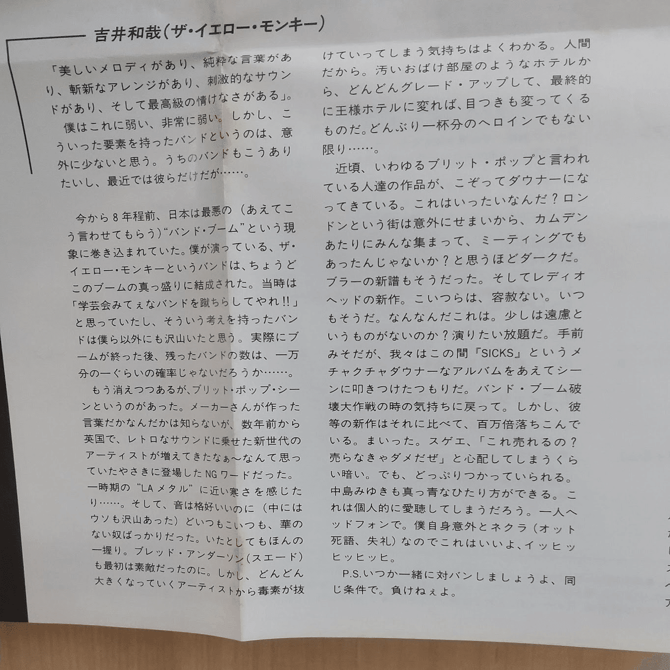 「美しいメロディがあり、純粋な言葉があり、斬新なアレンジがあり、刺激的なサウンドがあり、そして最高級の情けなさがある」。 僕はこれに弱い、非常に弱い。しかし、こういった要素を持ったバンドというのは、意外に少ないと思う。 うちのバンドもこうありたいし、最近では彼ら(注・レディオヘッド)だけだが......。