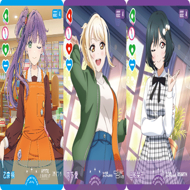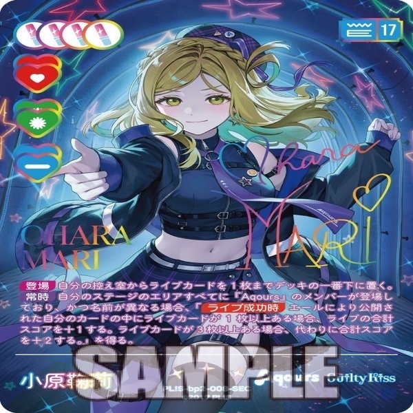 まず、Aqours全体の共通テキストである山下へのライブカード仕込みによって音符を積んでいき、初登場となる17コストのメンバー、鞠莉さんによる大型加点を噛まして焼き切る動きがメインギミックになりそうです。