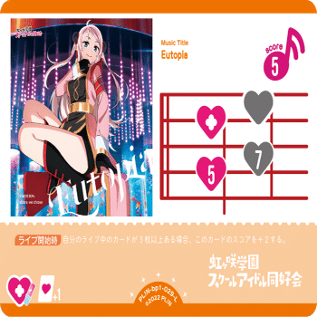 嵐珠の常時効果と同じ条件でライブスコアが+2される効果を持つライブカードです。12ハート5スコアのライブは概ね加点効果を持っていますが、他のライブは全て+1加点しか持っていません。つまり、同じハート数でライブすれば加点が多い分Eutopia擁する嵐珠の方が強い!単純な話ですね。
