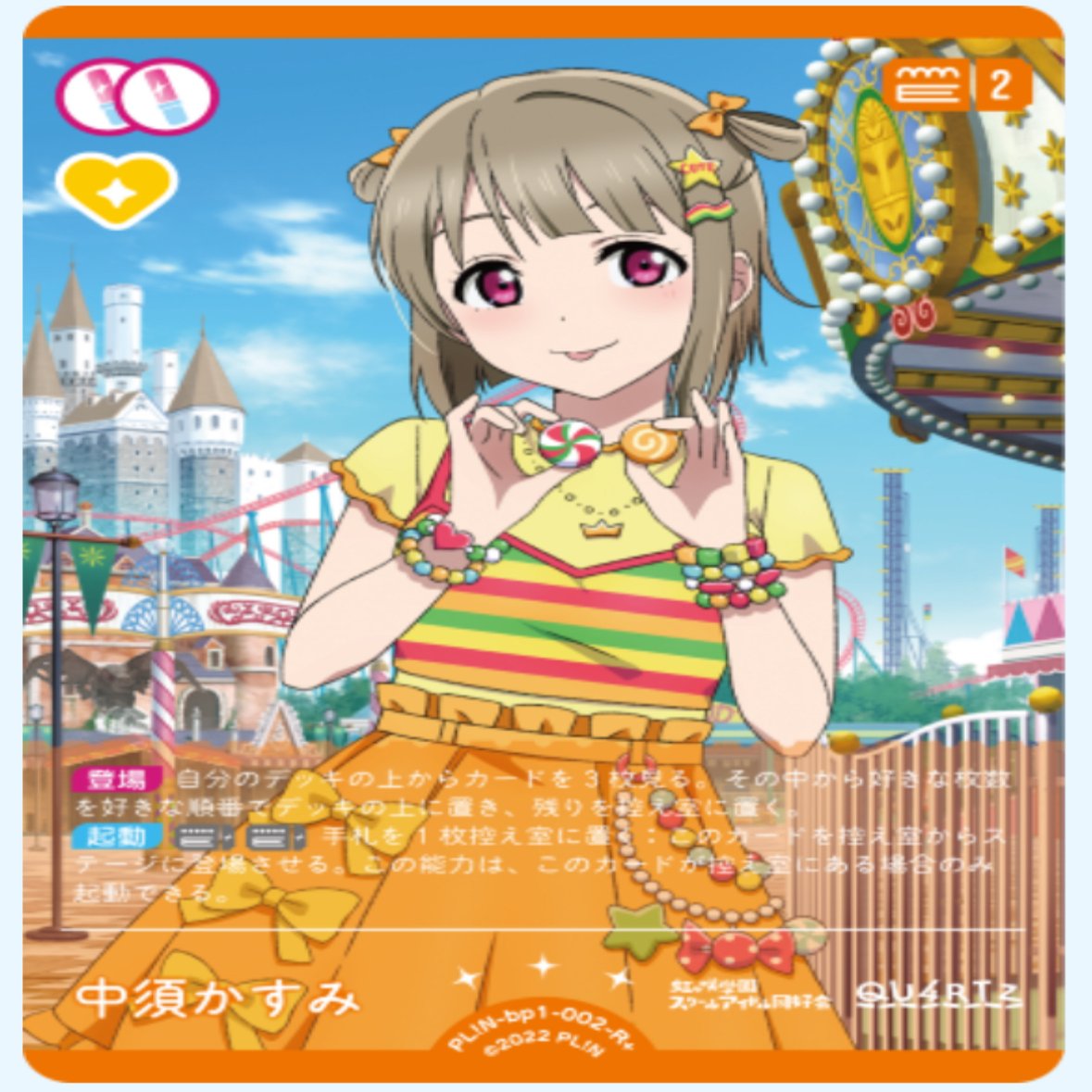 黄色のハートも自然に確保しやすく、前述のEutopiaのお供の1点ライブとして運用されることが多いです。しかしながら1点ライブはその存在自体が弱い(紫アグロが1ターン目から2点飛ばしてくるため)ので採用は慎重にならざるをえません。でもPoppinは4枚採用していいです、強いので。