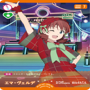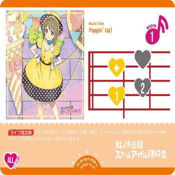 現環境における1スコアライブの中で頭3つくらい抜けて強いライブカードです。現状1スコアのライブは5種類ありますが、そのうち4種類は特殊ハート音符が付いており実質BHなしのカードです。更に色付きハートの要求数が1つなのもこのカードだけです。色付き要求なしの2種はハート4つが必要なため比較対象になりません。しかもなぜかおまけにライブに勝てば手札が増える効果も付いています。開発に絶対かすみん好きな奴いるだろ