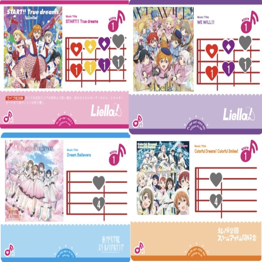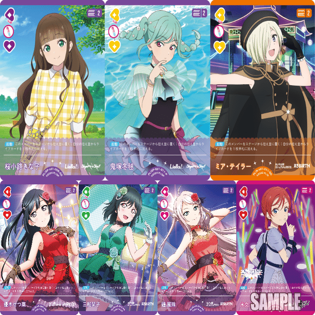 現在7種が実装されており、そのうち2種はリエラと虹ヶ咲のスタートデッキに1種ずつ、ブースターvol.1とプレミアムブースタースーパースターにも1種ずつ、あとの3種は3~4月度ショップ大会のプロモカードです。