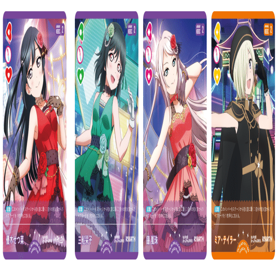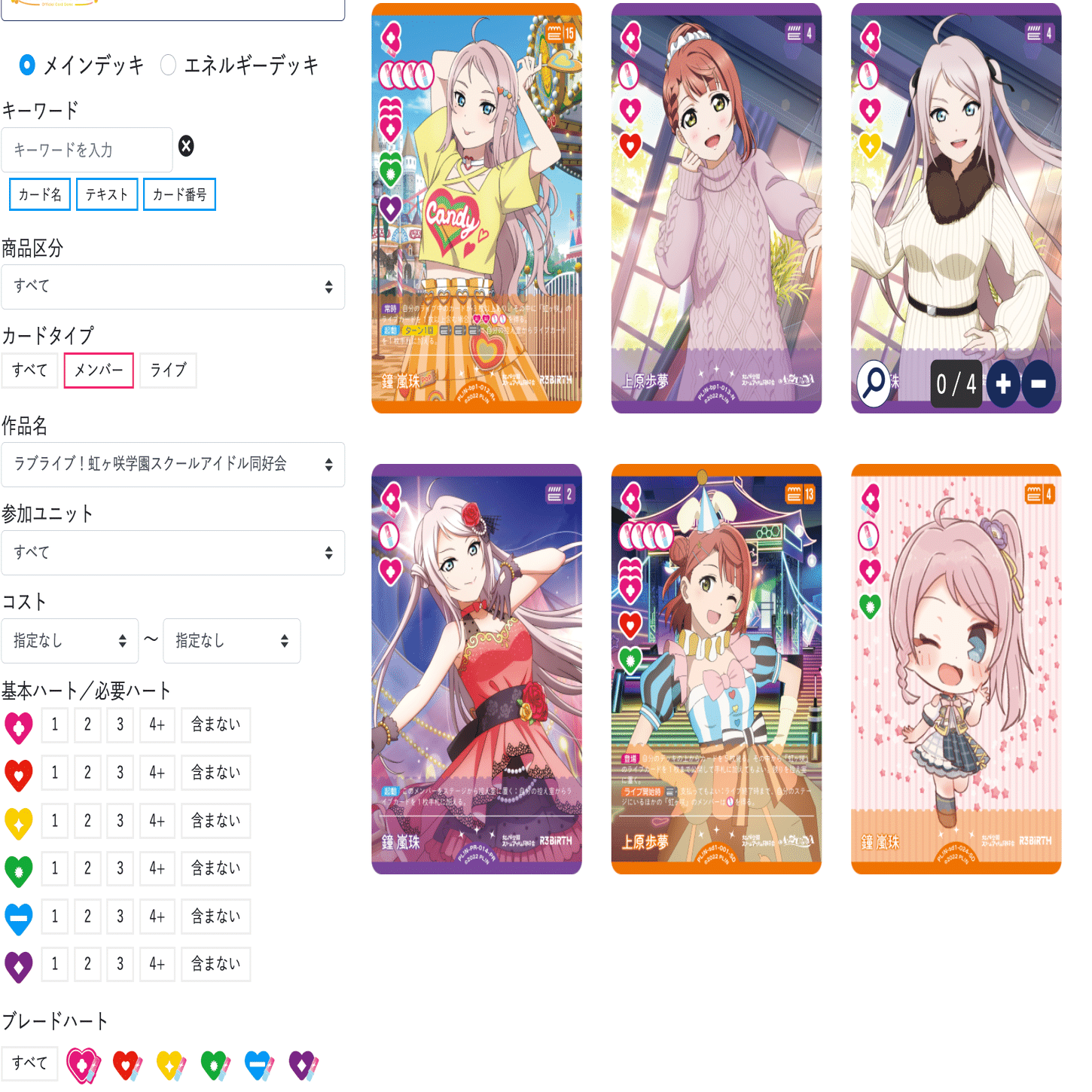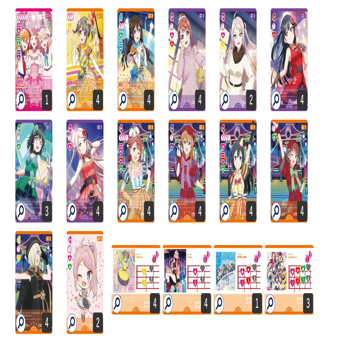 コスト4メンバーを8枚採用しているのはやや多い印象かもしれませんが、虹ヶ咲はピンク色ブレードハートを持つメンバーが少なかったため、あえて多めに採用しました。