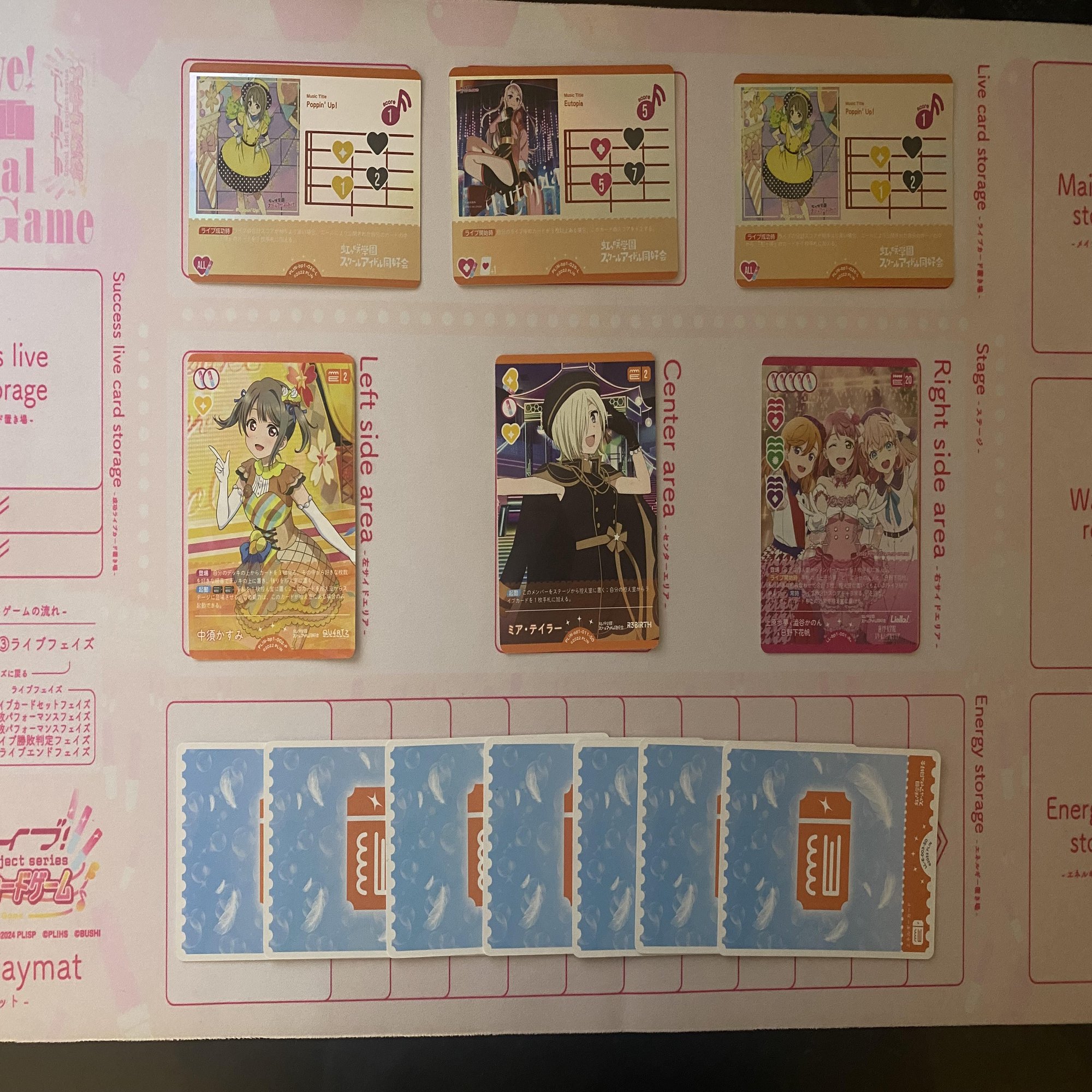 特に《Poppin' Up!》を2枚含めたライブを行う際、ブレードハートに黄色が欲しい場面がたびたびあるため、《ミア・テイラー》(コスト2)は非常に重宝しました。