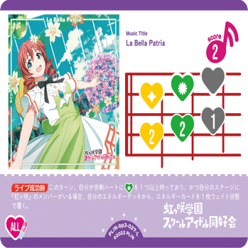 《La Bella Patria》のライブ開始時能力を起動できた場合、1エネルギー追加することができるので今までのエマランジュではできなかったステージ展開とライブを行うことができます。
