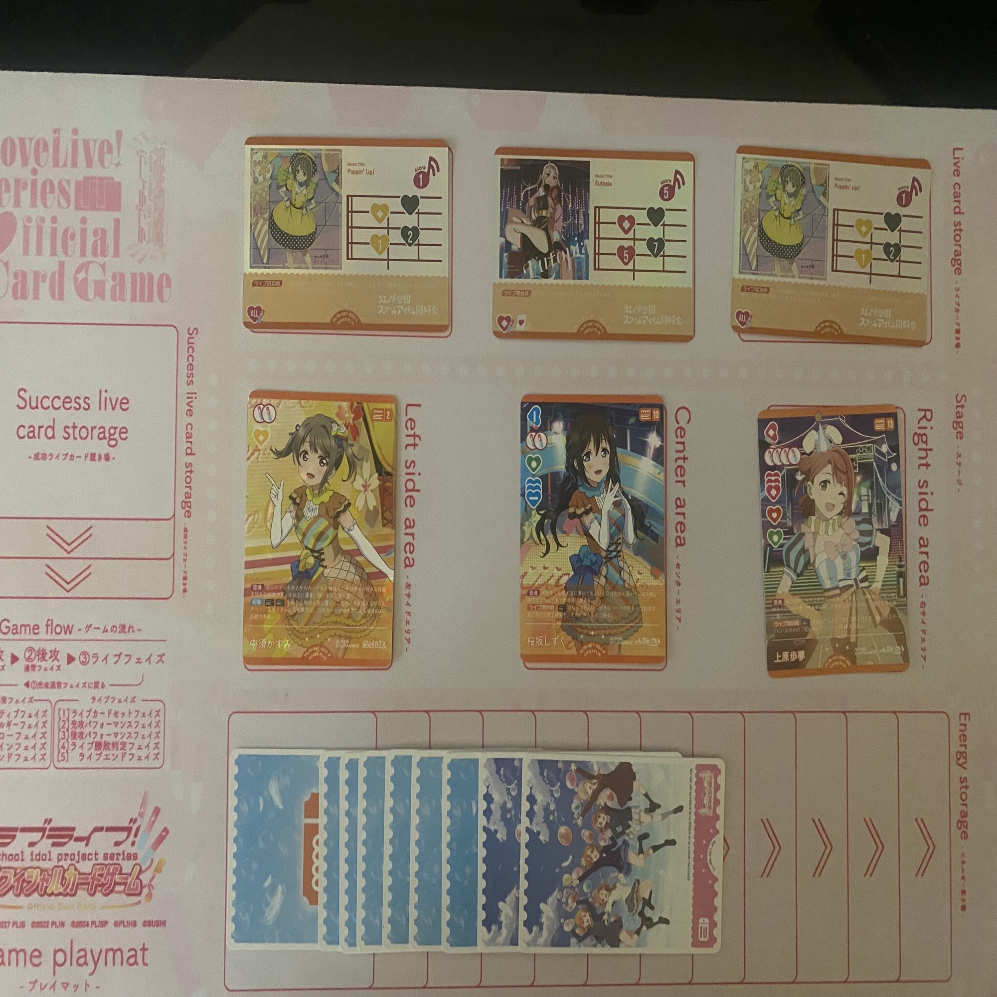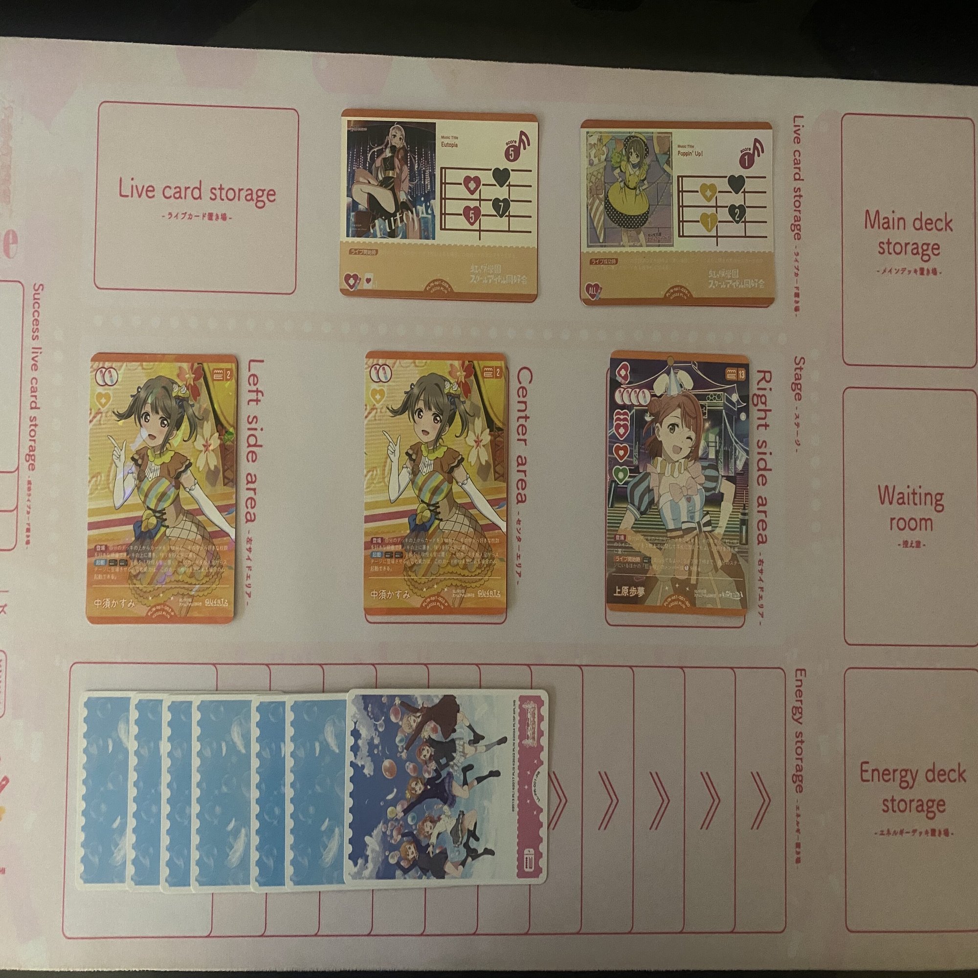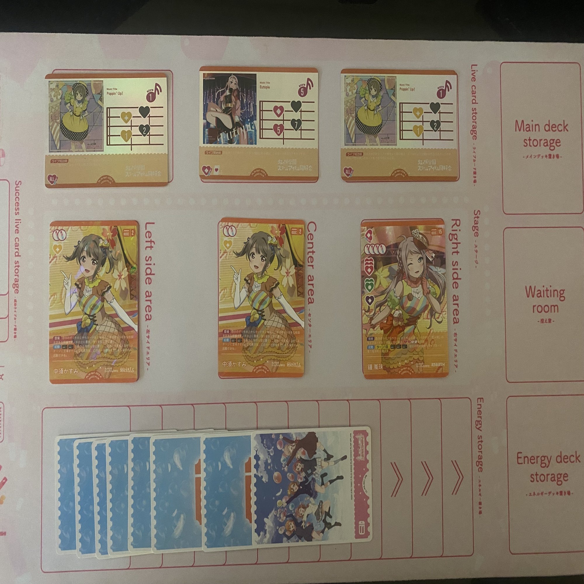 ライブ回収効果を持つメンバーを3回登場させた後に、《中須かすみ》(コスト2)などを追加で登場させることで、定番の《Eutopia》+《Poppin' Up!》×2といったライブ構成を実現できます。